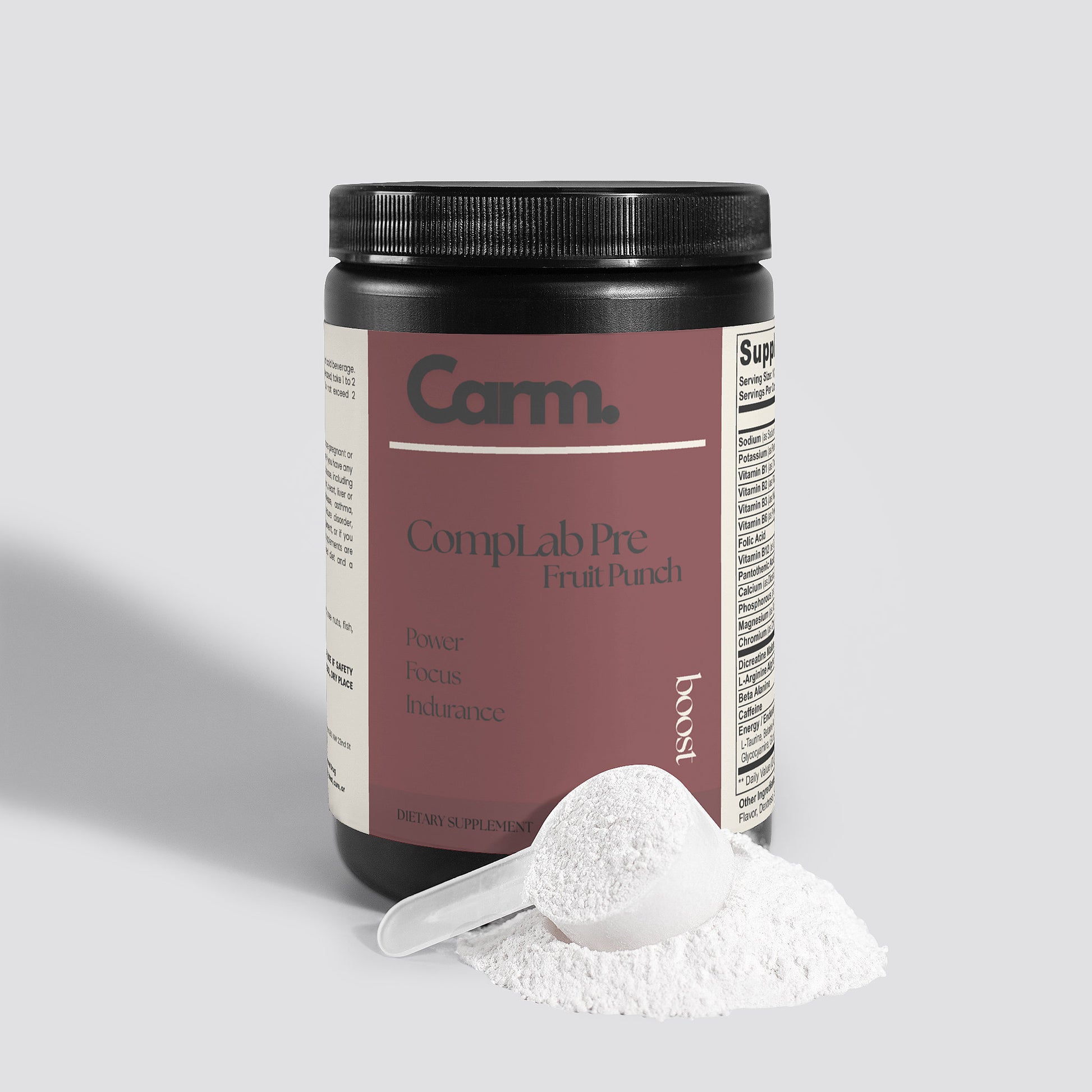 Ingredients: Sodium (as Sodium Citrate), Potassium (as Potassium Citrate), Vitamin B1 (as Thiamine Hydrochloride), Vitamin B2 (as Riboflavin), Vitamin B3 (as Niacin), Vitamin B6 (as Pyridoxine Hydrochloride), Folic Acid, Vitamin B12 (as Cyanocobalamin), Pantothenic Acid (as D-Calcium Pantothenate), Calcium (as Dicalcium Phosphate), Phosphorous (as Dicalcium Phosphate), Magnesium (as Magnesium Oxide), Chromium (as Chromium Nicotinate), Dicreatine Malate, L-Arginine Alpha Ketoglutarate, Beta Alanine, Caffeine, Energy/Endurance/Focus Matrix (L-Taurine, Betaine Anhydrous, Waxy Maize, L-Citrulline Malate, Glycocyamine, Glucuronolactone, L-Tyrosine, Maltodextrin, Citric Acid, Fruit Punch Flavor, Dextrose, Sucralose, Silicon Dioxide.